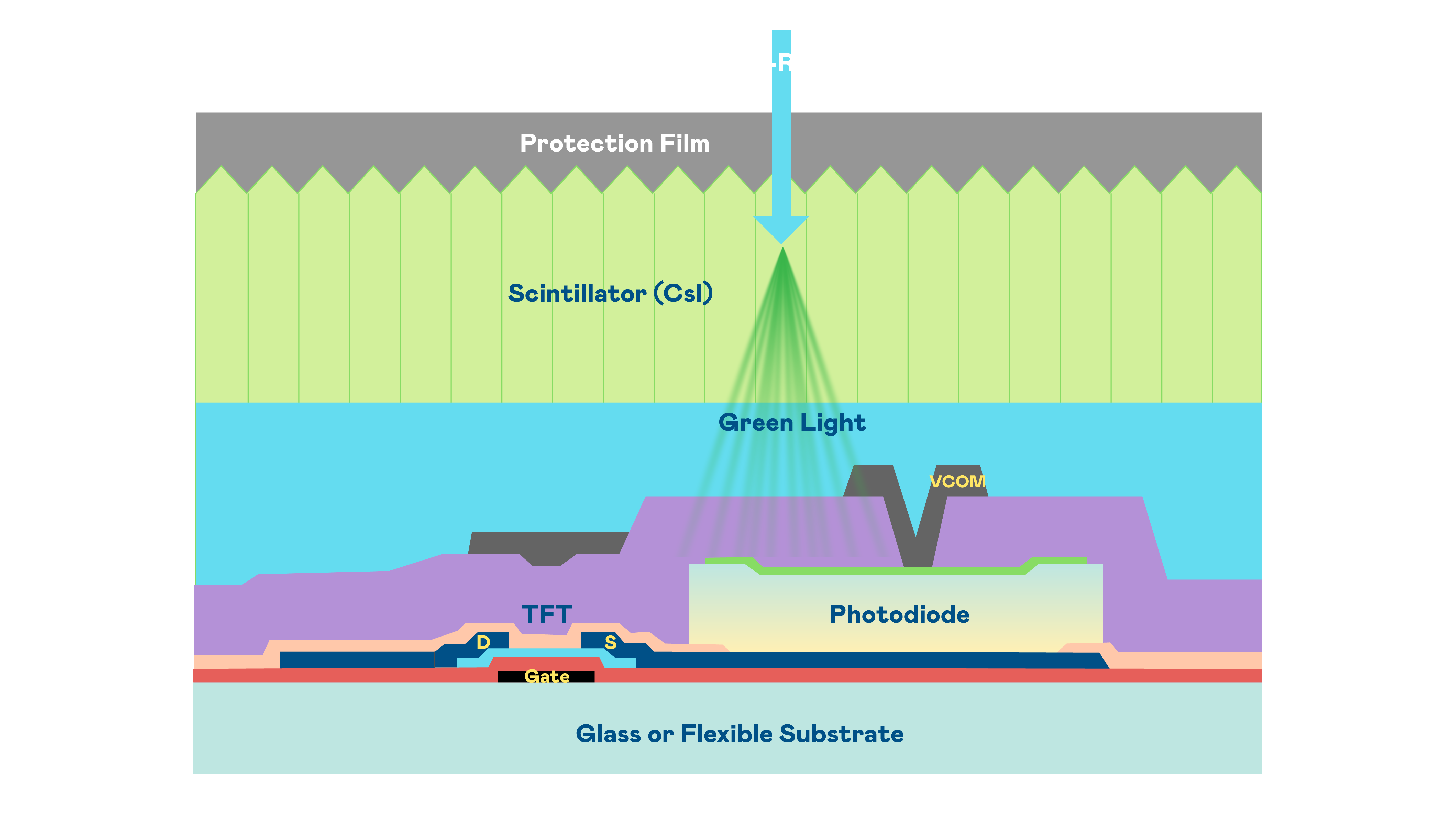 AGGAME的X光影像感测阵列使用薄膜电晶体 (TFT) 作为每个像素的读取开关,搭配光电二极体(Photodiode)的光电转换元件,用以感测X光影像讯号。
